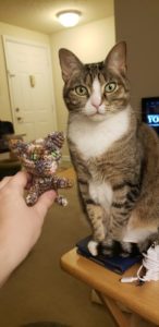 Despite some struggles, I managed to make a kitten I’m relatively happy with. I again went off script for the eyes, so the fact that I’m not happy here is entirely on me. But I’m blaming the uneven ears and the crooked muzzle on the pattern. The muzzle was 100% straight when I embroidered the nose, so how did it end up crooked when I sewed it to the head? I have no idea.