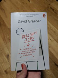The author spends the first chapters of the book developing a definition of bullshit jobs, which I appreciate. These aren’t shitty jobs, as those ones so ofter serve a purpose. No, these are the jobs that perhaps are middle management, or ‘box tickers.’ He ultimately offers five different categories, and support for them using anecdotes from people who contacted him after his original essay was published.