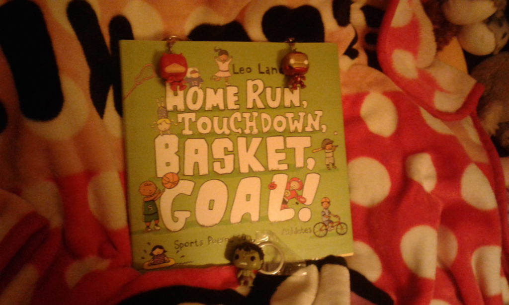 I have done my auntly duty flattening my tail-feathers on benches and bleachers, gotten eye and neck strain from trying to see a 9-year-old out in right field, been rained on, sunburned and eaten alive by a mosquito or two watching nephews playing sports. And while I can tell the difference between a puck and the goalie (usually) and which football Americans vs. Europeans are talking about, I am not a sports person. However, the other day, one of the publishes sent me a large, (shiny!) green package with some recently published books. One of those was Home Run, Touchdown, Basket, Goal!: Sports Poems for Little Athletes by Leo Landry.