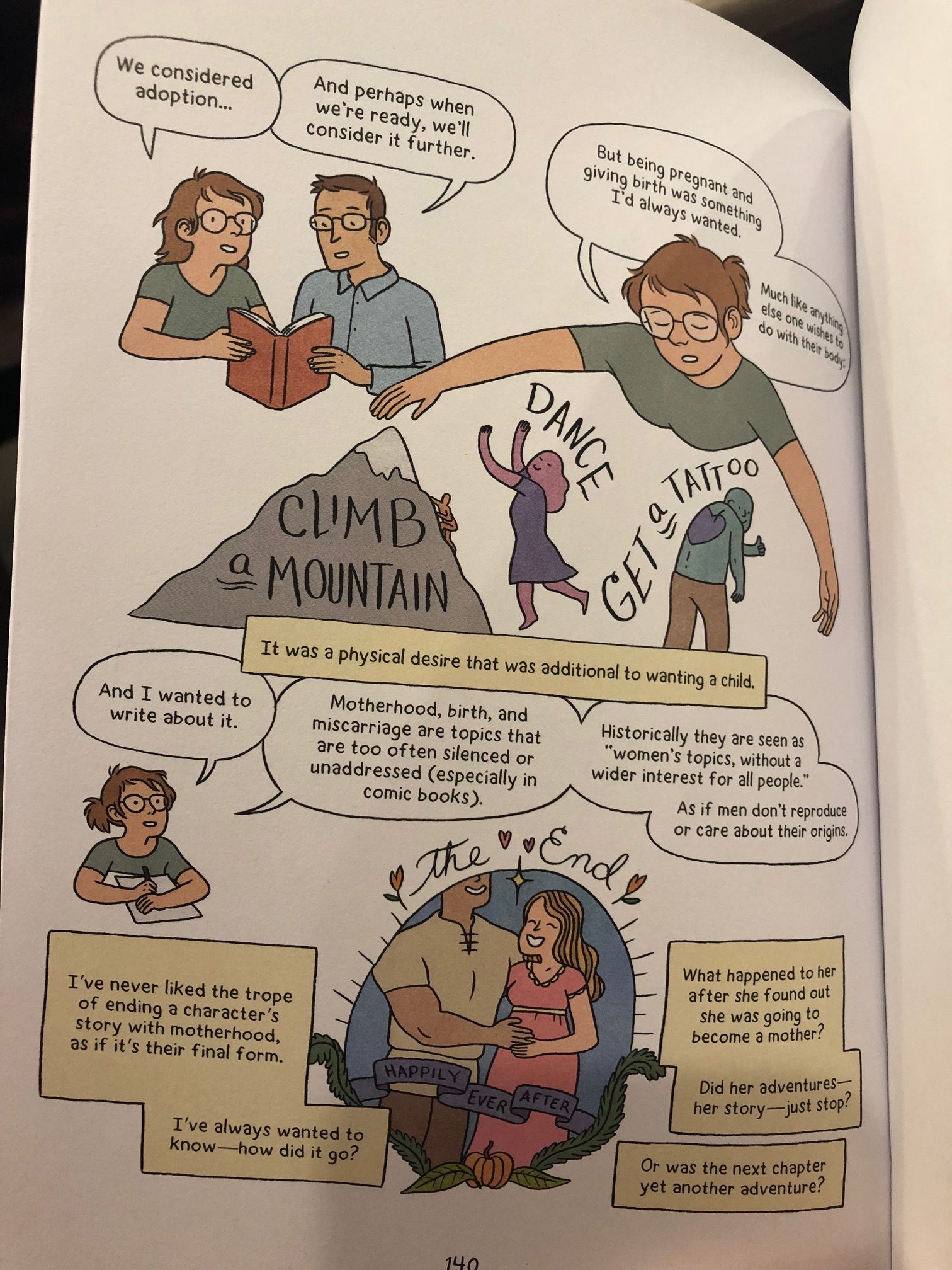 That’s what this book is about, how it went for Lucy, and she talks openly about every aspect, including her difficulties in her pregnancy with Pal (this is a pseudonym she uses for him, short for Little Palindrome, because he was born on a palindromic day) and her miscarriages. There is actually a lot of talk about openness itself, and how even though miscarriage and other reproductive issues are so, so common, no one talks about them, and so nearly every pregnant person who experiences them feels isolated and alone. She tackles the experience of being in a medical system that dismisses patient concerns (Knisley had pre-eclampsia that escalated into eclampsia during labor, and though she noted all the symptoms to her doctor and was worried about them over the course of her pregnancy, he brushed her fears aside as irrelevant, and then she almost died). It was pretty visceral at times, but it was also funny and happy. Her fears and insecurities get just as much play as her excitement and joy over the impending birth of their son.