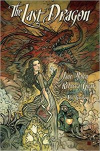 The Last Dragon is a beautiful book to hold. Colors are muted and layered, nothing is a single flat shade. Lighting has been carefully considered, illuminating and glowing as needed each panel. The “maiden” is an herbalist’s daughter named, Tansy. She is described as, “no color at all. She seemed to blend in with her surroundings” and the artist, Rebecca Guay, did an incredible job showing this. I also love the way Guay drew the dragon, so powerful and ferocious. It reminds me of a melding of western and eastern dragon traits.