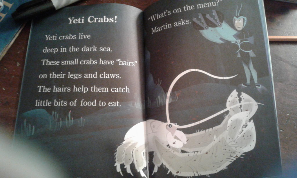 Of course, if the reader is not a fan of the Kratt Brothers Wild Kratt show, the illustrations might be a bit off putting as they are surreal and fantastical (the guys submarines look like the animal they are talking about, they put themselves in situations that are unrealistic). The colors are deep and bold reflecting the oceans image and creature talking about. Which are not always just the “usual suspects” but also include things like Yeti Crabs.