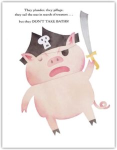 And Pirates Don’t Take Baths did not disappoint. It is a cute little board book about how everyone may not have to take a bath, but if you are a Pirate, they do not get sea sick, but our narrator does. Therefore, other options are given such as it might be hard to take a bath in space, so astronauts do not have to take baths, but as Mom points out, it is hard to do bodily functions in space (the image of our narrator shows that this is less than a pleasant thought) and so forth. However, because our little pigs’ mom is a smart cookie, she shows her picky bather how even a bath can be fun. The art is simple with not a lot of details but gets the point across.