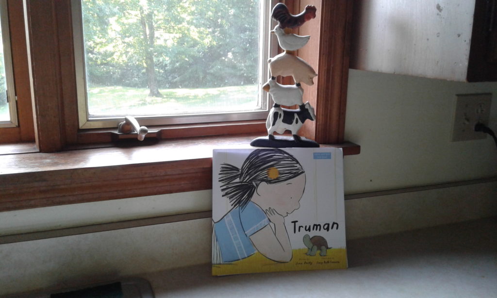 Truman is a fun book. It is not 100% to my personal tastes (as it might be a bit too cute) but there is still a lot to love. Jean Reidy created a story about friendships, changes and being brave. Truman (a turtle) and his human girl, Sarah, have a special relationship. But one day, Truman realizes that Sarah is not just looking at the Number 11 bus, she is getting on the bus! And she does not come back right away like she usually does. What is going on? To try and learn the answer, Truman takes himself on the adventure of a lifetime! Over rocks, long rugs with pitfalls (or some really scary looking toys Sarah did not put away) and no longer being able to see out the window which has been his only reference point up until then. Of course, happy endings all around occur.