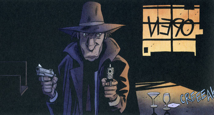 With that said, this book does slide pretty seamlessly from noir into science fiction, and is even a little creepy at time (the above characters face, for instance). So even if the art doesn’t really seem to fit, it works well enough for it not to be a significant issue.