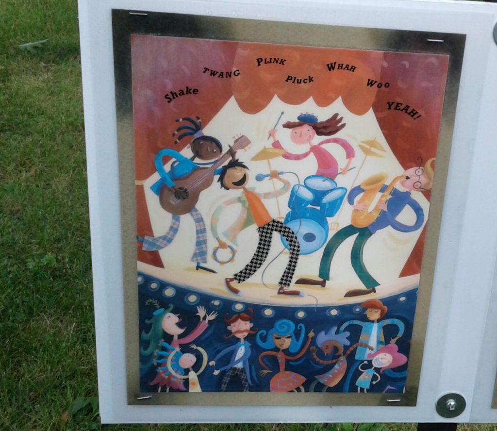 As I carefully walked and read, I thought “What an idea! A way to move as you read.” The “end pages” also said there was a second Story Walk at the main rec center. And you better believe, I will find my way there soon. This story was of Violet and her love of music was perfect for the sunny day. But it was also a just a great book for a rainy-day story-time.