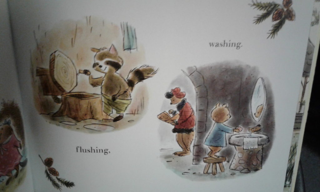 I would then go through Welcome to Morningtown almost four times before I picked up everything, as there is a slight twist to the ending. Which is and is not a surprise. This book is a sweet book about getting up in the morning. Blake Liliane Hellman’s story is all the things you do when you get up: brush teeth, eat breakfast, do chores, get ready for the day in all the various ways we do. It has a Richard Scarry element with the cute, cuddly critters of Steven Henry. If it was not for the literal bathroom humor, there would be very little to make this stand out.