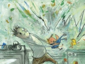 I had high hopes for the illustrations. Timothy Basil Ering can create some terribly funny pieces of work. He also is pretty darn funny himself. My autographed copy of The Tale of Despereaux has a mistake with my name (he put a G instead of a J) and found a way to show there are no mistakes, just opportunities to create something different. But here, we have a bald child, odd faced parents, melted colors and some abstract images that lean towards the bizarre.