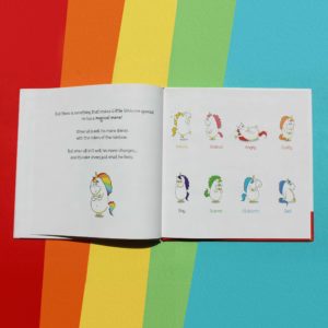The use of colors to show the different feelings. This, for some reason, amused me. The rainbow mane when all is well “drains” into red, yellow, pink, orange, green, blues. This physical change helps show how Little Unicorn is not only feeling but allows your child to be able to guess before going to far into the story. The art itself is quirky and cozy. The cartoon aspect will most likely endure them to readers of all ages.
