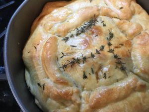 The second non sourdough recipe I made is the Cheese and Onion Pie with hot water crust. I don’t have access to Lancashire cheese, so I used a good cheddar. The onions cooked with butter and thyme looked and smelled amazing. As with the apple cake, the direction that I cook the onions in a medium pan was laughable. Also, as with the apple cake, the onions released a ton of liquid, with no direction about what to do with it. I know pastry well enough that I knew better than to They weren’t as jammy as the caramelized onions I make regularly, but I would make it again for other recipes. My heart sank when I got going on the hot water crust. When I attempted the brioche dough, the problems started when I mixed the second refresh with the flour and egg. It wasn’t enough liquid and I ended up with concrete pellets. The same thing started to happen with the crust dough. I deviated from the recipe and added the melted butter and water before the flour and egg were well mixed. I still had to work out some hard clumps. In the end, this was a lovely savory pie. I didn’t worry about making the top of my crust beautiful. It was tasty warm and it was tasty the next day cold. So yay! Something worked. I’m not sure I would actually make this particular pie again, but I will use the hot water crust recipe again. And the onions.