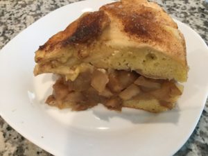 I gave up on the sourdough and tried two of the non sourdough recipes near the end. I decided to make Perlette’s Apple Cake. I have been making a different gateau aux pommes for 20 years, so this would be an interesting change. The recipe calls for 6 pounds of apples, 4 of which are cored, peeled and roughly chopped and then cooked in a medium pan. What I would consider a medium pan was insufficient to hold the apples. The apples also produced a lot of liquid and the recipe doesn’t make clear whether that liquid should be incorporated or strained off. I ended up draining the apples, which left me with a lot of sugary, cinnamony apple liquid. The recipe said to bake at 325 F for 70 – 90 minutes. I baked this cake for almost 2 hours before the tester in the center of the cake came out cleanish. Once cooled enough to slice, I found that the texture ranged from under baked custard in the middle to over baked custard at the edge. It was really more like a cake sitting uneasily on top of a pie. The coarsely chopped apples cooked in sugar and cinnamon were tasty, though extremely cinnamony. The layer with the thinly sliced apples and batter on top had an unpleasant texture. The batter under the coarsely chopped apples seems to have just given up. I am not an amateur baker, so I feel pretty confident that the problem is the recipe. I was left with a cake I don’t want to eat and would never serve to a guest.