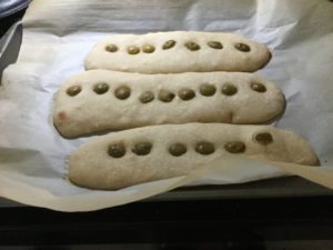 Initially, I was going to go right for the sourdough croissants, but then I then I realized I needed to bake a loaf of bread first. So my first bake, once I got a starter going was the Finchley Sticks. Finchley Sticks were what Margot Bakery created when they were learning to shape baguettes. the ugly loaves got olives put on top and then baked in all their misshapen glory. This seemed like a good place for me to start. It was not a good place to start. I haven’t had this disastrous a bread bake in a couple of decades. The recipe called for the dough to sit in the refrigerator for 12 – 36 hours. I suspect that my American refrigerator was too cold for the wild yeast colony. When I pulled it our 18 hours later, it was limp and lifeless. My Finchley Sticks baked into very dense, chewy flatbreads.