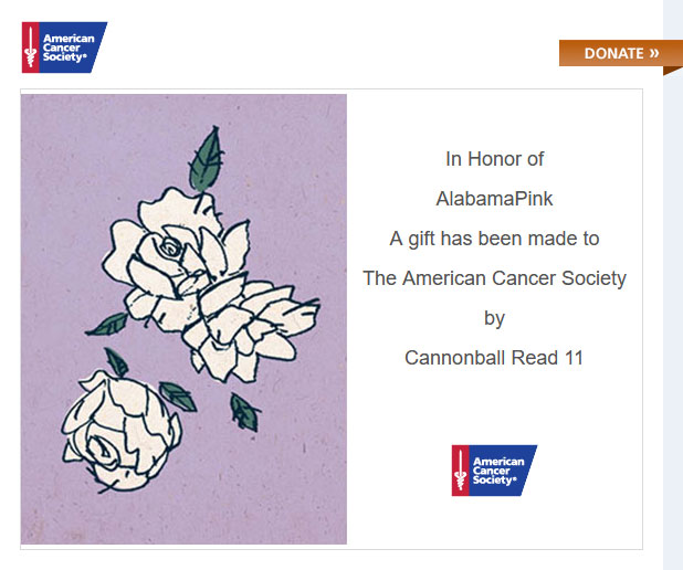 Today we made our second donation of CBR11 to the American Cancer Society in memory of AlabamaPink. Thanks to generous contributions from people like you, ad revenue from this site, profits from our merchandise on RedBubble and earnings from our Amazon affiliate links, we’ve been able to give $125 today. Along with our donation in May, that brings us to $325 for the year, and brings our grand total of donations to $4,950. So close to 5K! We’ll be having a big donation push in November for #GivingTuesday, but you can support CBR at any time. Thanks to all of you.