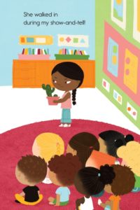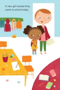 What it is, is the new girl, Amy, at school. She comes in the middle of our narrators show and tell. She later scores a goal off our young gal (obviously to make her look bad) and so forth. Finally, our gal has had enough and walks away, only to have a teacher ask her what the issue is. And tells her that there are two sides to this story. The language is straight forward, with some humor and great descriptions (the show and tell item was a cactus and our narrator felt as prickly as that cactus when the spotlight was taken away from her). The story is modern but not preachy. Part of the modern story aspect is the diverse characters. Hilli Kushnir’s illustrations are delightful. They are colorful, slightly polished, but not annoyingly so. There are details of the school rooms, playground, etc. but are not overpowering the senses.