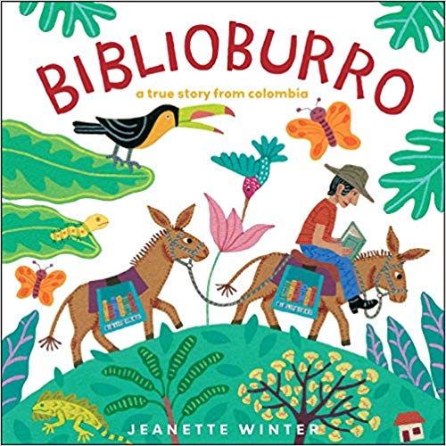 Biblioburro: A True Story from Colombia caught my eye because of the vivid cover illustration. It hinted at being a Tomie de Paola story but was not actually feeling 100% right. On closer inspection I learned that this was a Jeanette Winter story.