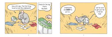 This time we have a little mouse all excited to go to the barn with his family. Mother Mouse calls to if from off page to see if he is ready. He tells her in a few minutes. Breaking the fourth wall (or perhaps talking to himself) we see mouse first put on the undies (they are easy), the socks and finally the pants (he has to sit down for that). But then it is onto the shirt which gives him some trouble (buttons you know are bigger than the hole they go through). Eventually he gets it and now he is all ready to run off and enjoy all the fun things in the barn…. Or is he?? A silly twist happens in this graphic novel format for an early to mid-level reader.