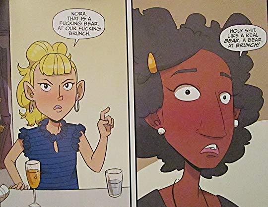 Nora is stuck in a dead-end relationship (with a human) who she breaks up with over a camping trip- a camping trip she throws away a magazine with her address. A bear finds her house, they move in together and fall in love. Nora’s family and friends are understandably shocked and confused as to why Nora would want to be in a relationship with an actual bear- a bear who doesn’t speak English and they never fully explain how they’re intimate except to imply that they are… Again, I know I should be suspending my disbelief and going with the flow but it is pretty clear this takes place in the “real world” with the only out of the ordinary thing going on being that Nora’s boyfriend is a bear.