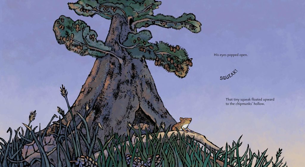 It is a cozy, quaint, snug and secure story. A mouse wakes early in the morning, its tiny squeak disturbs another animal, which in turn disturbs another and another as their squawks, squeaks, calls and cries go out across the once sleepy, now waking, forest. And takes a full circle right back to where we started.