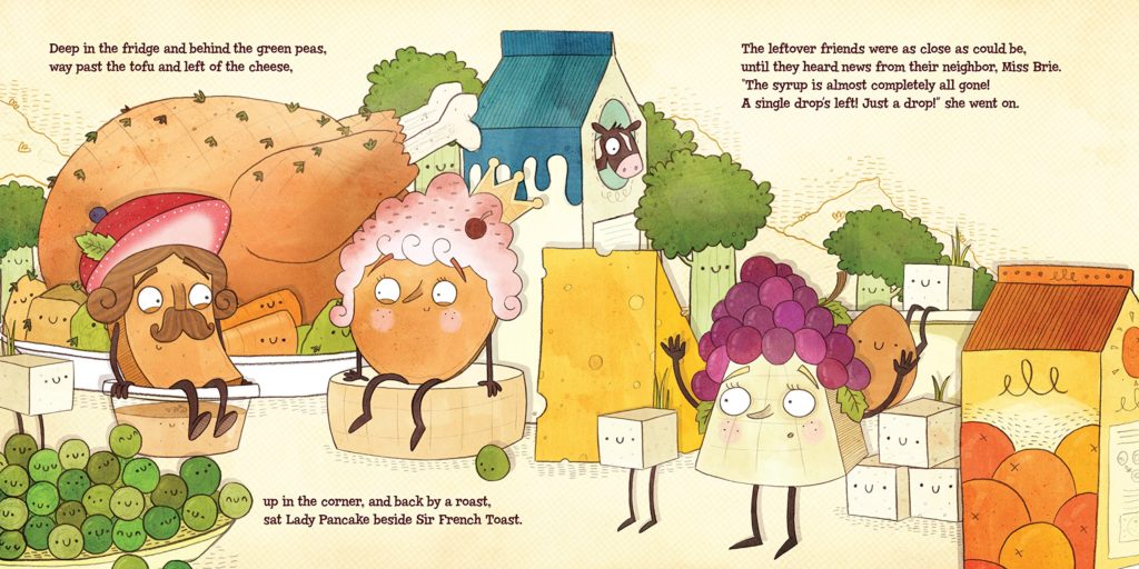 Okay, I will get me started on the illustrations. Brendan Kerney took time and effort to create these characters, and for that I can appreciate them. Yet, French toast should not have a mustache and my maple syrup bottle better not have a sad face on it. Even if it is empty. These characters in Funk’s story are just downright creepy.