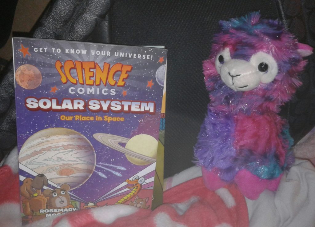 I was never a science kid. However, if I had some of the graphic novels that First Second does for their Science Comics series, I might have been. And in the Science Comics: Solar System: Our Place in Space by Rosemary Mosco (illustrations by Jon Chad), we learn about the solar system in a clever and cute way. Two best friends, Sara (home sick) and Jill (trying to cheer her up by stopping her boredom) tell a story of how their pets (in true tongue-in-cheek science-fiction humor) blast off into space to give us a look at the world beyond. (You will later learn that both girls are named after two female scientists and there is a nod to another scientist as well).