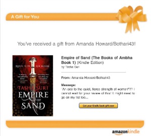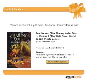 Bothari43 has been very kind to me this Book Exchange season. She sent me three ebooks – Anna Zabo’s Syncopation (sorry about your search algorithm), Tasha Suri’s Empire of Sand, and Lois McMaster Bujold’s Beguilement (The Sharing Knife). In addition to that largess, I now have a lovely cephalopod print and a 5 year daily journal of questions and answers. I am so excited!