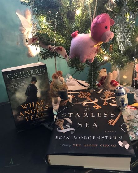 Many thanks to the AWESOME Jen K for my lovely Book Exchange gift – a great book spine infinity scarf to keep me cozy while reading The Starless Sea by Erin Morgenstern and What Angels Fear by C. S. Harris.