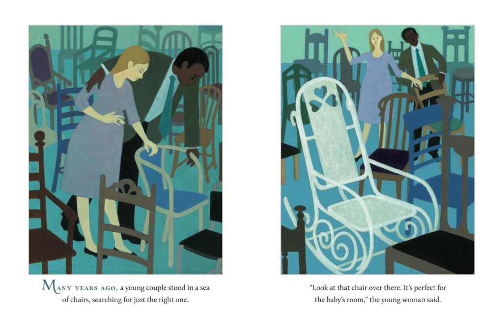 While the story is simple and we have seen parts of it before, the illustrations are pure gold. They outdid themselves again! The story is a young couple who got married, soon needed a chair for the nursery and soon found the perfect one. A rocking chair. Not too long afterwards, the couple had their son; who would partake of the chair by being read to in it and by playing with it (it was a great race horse). He grew up, no longer needing the rocking chair, until many years later when it is dusted off for another special arrival. The part of the story we have seen before is the story of love of the family. The part that is not seen before is that this is the story of the Dillon’s. We see Diane and Leo married, the birth of the son and his growing up, we see Leo passing away, we see the son coming home with the girl he wishes to marry, we see the little granddaughter who gets to experience the love of the chair, too (being comforted in it by her grandmother as the grandfather watches from photographs and making that chair a grand sailing ship).