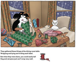 The rhyming text is a cliched tactic. Holiday (especially Christmas) books have had this technique done again and again and again and … you get the point. The artwork is, at best, a bad cartoon TV special you remember seeing as a child, find it on some cable station, watch and remember why you did not go looking for it before now. The fact the kids believe that the cat and dog wrote the tags and wrapped the gifts they find under the tree without blinking is spooky. The arrogance of the children is believable, but pointless. Perhaps if all of them (children and pets) realized that the storm was so bad that Santa missed them and then the four of them try to make Christmas special for the rest of the family, maybe that would have been more charming. There is the one piece of the story (though tainted by a seemly passive insult) is where the pets try to contact Santa by barking and one tiny meow that (of course) was just the right amount of push needed to send the message to The Big Guy Up North.