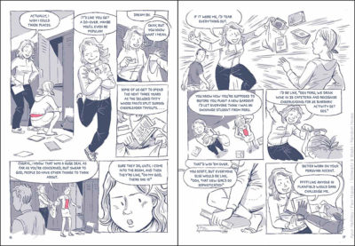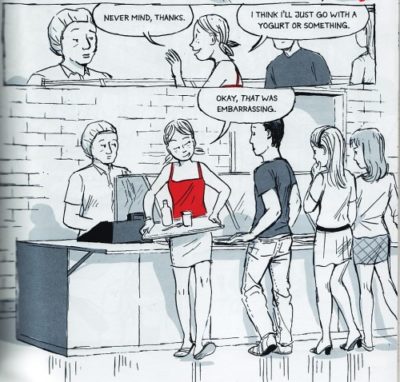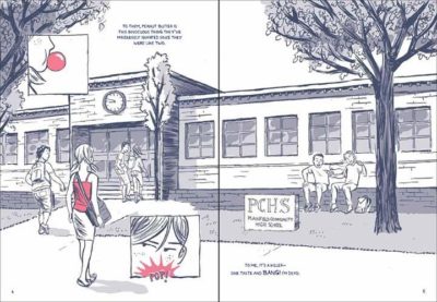 Ayun Halliday’s Peanut is a slightly different take on trying to fit in. It is a semi-text heavy graphic novel with sketch-like art by Paul Hoppe. And to show the main character, Sadie, she is the only one who has color. Which is the color red. This makes it a little hard at times to keep track of some characters as they have similar looks, shapes and sizes. I am assuming red is to symbolize that Sadie is different, she now stands out, she will not have to put a cute-guy picture on her locker as she now has a real-life cute boyfriend called, Zoo. And later, she is the Scarlett Woman: she is marked by the fact her allergy is not true.