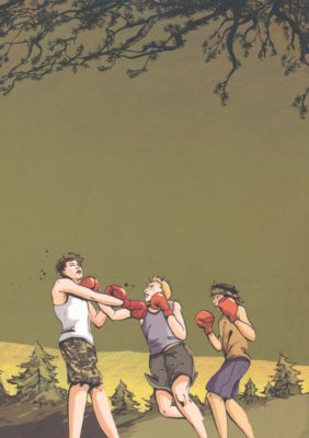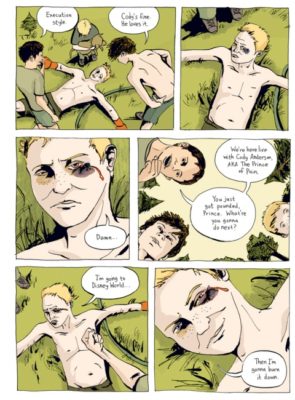 Danica Novgorodoff and others made a story that is about the everyday. The mundane. The unknowns. The violence that comes from fear, hate, boredom, trying to impress. There is nothing to like (except for some raw lines that show you everything you need to know about the person saying them) but it is something to experience. Even the illustrations are as dull and unimaginative as the characters and the town. Here is where most of the violence is seen (the beatings, blood human and deer, black eyes, the afterwards of one character and his “the morning after” happenings) yet, it is almost black and white. There are only browns/grey/dullness coloring showing what a Midwestern, becoming a ghost town, looks like. What poor really looks like.