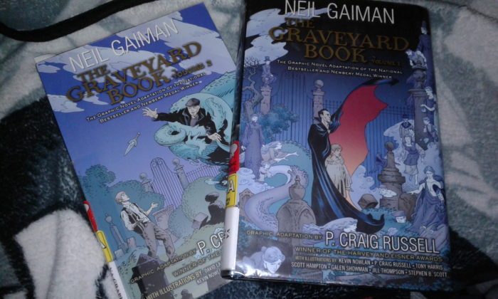 The two volumes are an interestingly wild ride. I wish I had found a complete one volume (hence why I dashed off to the library before I had finished volume one, I did not want to forget anything from book one). It is a serious story with dark and dry humor. You need to take your time reading as there are many levels to the story. Each chapter is set up slightly different with the passing of time. There can be as little as a year or two that has passed or could be several years that passed all at once. There is this classic feeling to the text. It feels as if it was written in the early 1900’s or even earlier. There is a classic feel to the setting as well. It could be set from the mid-1900’s to as late as the 1980’s. There is an other-worldliness as if this is a parallel world to ours. This is highlighted by the fact our hero, Nobody Owens (or Bod) speaks to ghosts, his main guardian is a creature of the night (neither alive nor dead, which is important later). Bod also can “fade” out of immediate sight, walk in dreams, and other supernatural events occur.