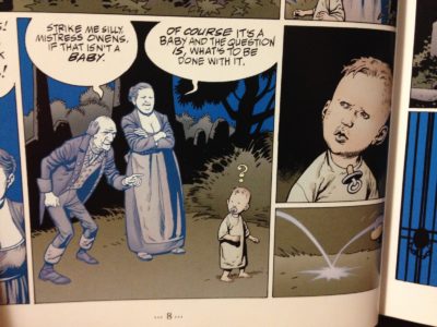 Each chapter is illustrated by different artists. The different illustrators are at once not an issue as they are similar, but sometimes it can take you out of the story (such as the character Silas has a different look each time). I am unfamiliar with most of the illustrators, or not aware of having seen them before. They include (but not limited to): Kevin Nowlan, Scott Hampton, Jill Thompson, and Galen Showman. They are typical graphic novel artwork. Color plays a large roll and looking at details will tell pieces of the story. The biggest issues are due to the physical darkness of the pages (it is set mostly in a graveyard and most action occurring at night) and the text blends into the art. This is because of the darkness and there are multiple panels to most pages, squishing everything together. Too much text has been crammed into it, making the text hard to see/read. This caused me to not want to finish at times.