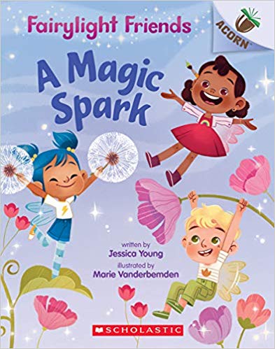 Then our second (and final mention) is A Magic Spark (Fairylight Friends #01). Jessica Young starts this series with a cute story about friendship, finding your talent and having fun. Ruby, Iris and Pip become fast friends on their first day of fairy school. This early to middle reader book has each fairy having solo or together adventures. In separate but connected chapters/stories, each fairy learns about themselves, the world around them and what magical power they have. These characters are modern in their looks, actions and personality. They are your children (they like to bake, make art, grow flowers, look at stars, spend time with friends and have fun). They learn lessons along the way (the stars are too far; you must do dishes then eat cake and patience is important). Also, they are all about fun. For ages kindergarten (high) to second grade.