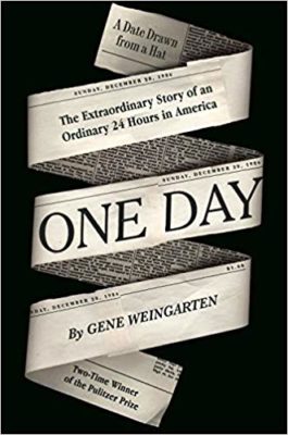 I discovered One Day by Gene Weingarten on NPR’s Best Books of 2019 List. It looked interesting, but I wasn’t sure I had the time to read it. When I found it available at my library on audio, I decided that was the perfect solution. I’d listen to the book in my car. For me, listening to a book is a very different experience from reading it. I generally prefer reading, where I can easily glance back if I find I’ve stopped paying attention or want to confirm a name. Because this book consists of a number of relatively short, non-fiction stories, I was hopeful I would be able to pay attention.
