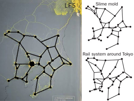 Not only are slime molds good at finding their way, they are able to design an efficient railway network. In one study, researchers distributed oat flakes (yummy slime mold treats) in patterns that mimicked the layout of cities around Tokyo and then let the slime molds loose. The slime molds built networks to distribute the nutrients that eventually. . . wait for it. . . looked strikingly similar to Tokyo’s actual rail system.