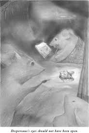 pathetic and sickly his mother, with a flair for the dramatic (she is named Antoinette and has all the sensitivity of her royal namesake) names him Despereaux “for all the sadness, for the many despairs of this place.” (Quickly adding, “Now where is my mirror?” DiCamillo has a flair for humor that is just a touch dark—enough to be amusing to adults without going full-on Grimm Brothers.) Little Despereaux survives against his family’s expectations, but he proves to be a bit odd. Instead of scurrying about and hiding in corners, he’s drawn to open spaces and light. Instead of chewing on the pages of