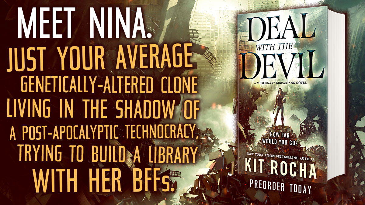 Deal With the Devil sets the groundwork for the bigger fights to come in the series. The fights to come in the series are a proxy for what we face in the here and now. This may not be a romance, but Kit Rocha comes from Romancelandia and they have infused this book with hope. We are currently faced with an increasingly difficult survival and an uncertain future. What can we do to make the world better when we aren’t enhanced by genetic manipulation or implants to fight for a better world? Nina’s super powers aren’t what make her a force of change, it’s her choices. She preserves and she builds. She redistributes resources. She offers knowledge freely. She is a librarian.
