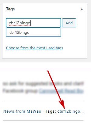 The cbr12bingo tag in the Tags box in Edit Post, and at the bottom of your review. You must tag the review on cannonballread.com with cbr12bingo and not any other variation. When using the autofill, make sure you are selecting cbr12bingo. Please do not add the ‘#’ in your tag, just the text cbr12bingo, all one word.