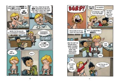 Judd Winick created a book that he probably wanted to read as a kid (and I am sure wants to as an adult). His art is funny, delightful, bright and perfectly detailed. The illustrations are happy. They bounce the story along. They help (literally) illustrate Hilo’s humor, enjoyment and the fact he talks out of his toe at one point. They show D.J. confused, determined and ready to go. They show Gina and her exasperation at her seemingly identical sisters (who are a lovely stereotype of older, cooler, cheer leading girls). I want to know these three kids. I want to read the other four books in the series. And I hope you do, too!