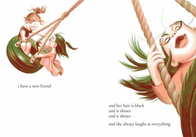 Okay, not the same way, but the feeling is the same. Our young narrator talks about how she has a best friend (though she is not sure as she’s never had one before). And we see all the wonderful things that they do together. They laugh and know they are best friends as the BF likes strawberry ice cream and our narrator doesn’t but that is okay. They like the fact that one can pretend to be a pickle (How awesome is that?) And we see the transformation of the narrator from child to actual imaginary pickle with Jillian Tamaki’s off the hook sweet and perfectly fitting the text illustrations. And, as the playtime winds down, our narrator says that the next time they play they will write their names on the sidewalk, like “this” (again shown by Tamaki’s art). SPOILER START: Only the narrator is not sure how her best friend would write her name as she did not ask her what it was! I interpreted this to mean, little kids just make friends and they are best friends right off when they hit it off. Names are not important. END OF SPOILER