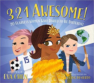 I was pleasantly surprised with this 321 Awesome! 20 Fearless Women Who Dared to be Different by Eva Chen. Books that list influential women can be a bit preachy or only have the same women always used. Yet, not only does it have “popular” people one would know, it has people you do not normally see in a book about women as influencers. However, there are a few people that not everyone will agree should be included (JK Rowling, Temple Grandin, Rhianna). This variety is what makes it fresh and interesting to talk about. It is also a counting book. The number used with the person represents something that person has done. To use JK Rowling her number is 12 as in the 12 times she was rejected by publishers.