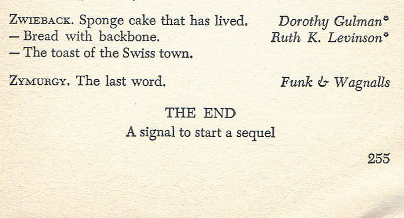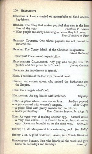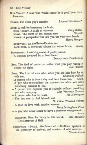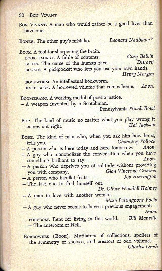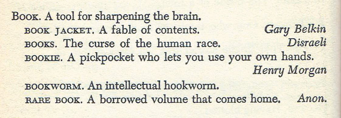 The cover notes that The Left Handed Dictionary is “5,000 definitions that once tripped gaily off the slightly forked tongues of Fred Allen, Russell Baker, H. L. Mencken, Dorothy Parker, E. B. White, and others, not to mention L.L.L. himself.” Looking through it, you’ll find it’s a book of quotations unusually organized in dictionary style, with the subject of the quote being the defined word. So rather than quoting Gary Belkin saying “A book is a tool for sharpening the brain,” it’s laid out on the page as such: