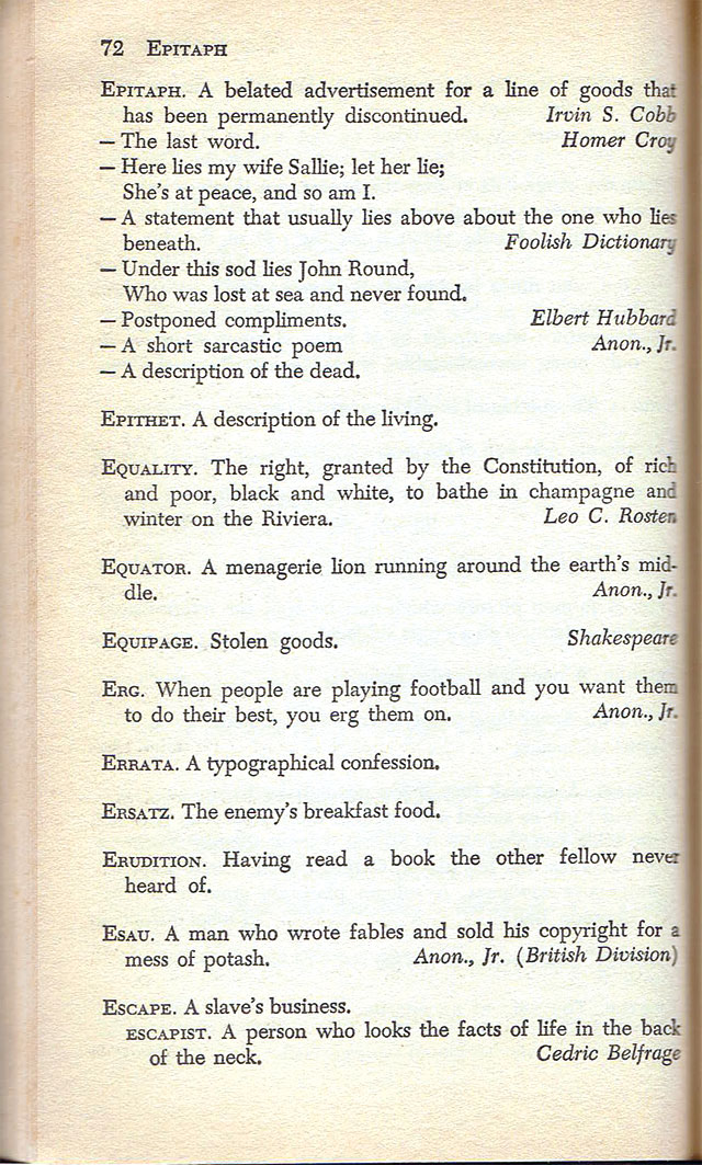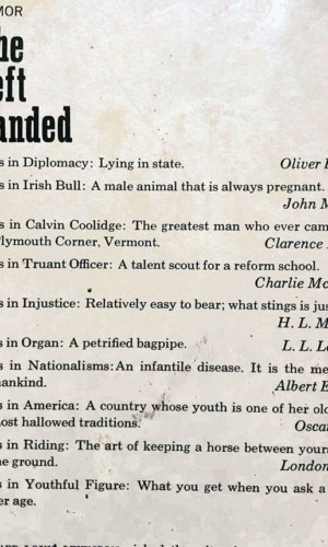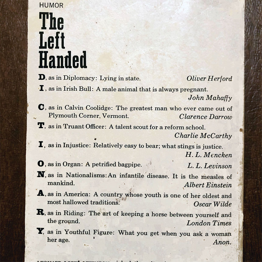 For me, it all goes back to the 8th grade, when I was given a paperback copy of The Left Handed Dictionary by Leonard Louis Levinson. Our middle school’s vice principal gave it to me when he was cleaning things out before summer break. I don’t know if he knew what he was doing by giving me this slim volume of bon mots.