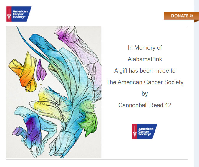 We are heading into the home stretch of 2020, and I’m pleased to announce we have made our third quarter donation to the American Cancer Society in the amount of $175. That brings our total for the year to $325, and our grand total of donations to ACS from all of the Cannonball Reads increases to $6,925.