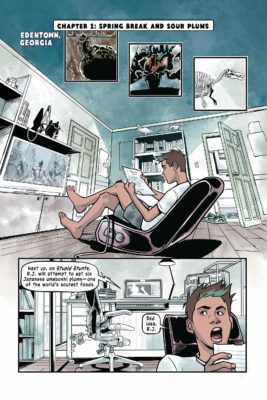 Then there are the illustrations of Gabriel Picolo. They are detailed, colored in the classic graphic novel/comic format and move the story along as much as the text (when Gar is getting some python hugs, you would probably not appreciate as much if you just read the situation. Plus, it shows the humor along with the serious. After BB’s first transformation, he ends up in his birthday suit, with a item placed