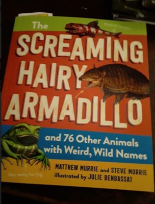 The Screaming Hairy Armadillo and 76 Other Animals with Weird, Wild Names by Matthew Murrie and Steve Murrie is a funny and gross and wonderful facts about some funny named, deliciously named and weirdly named animals. You learn the naked mole rat is not a rat or a mole. But is naked and eats its own poop. You learn that when it “snows” in the deepest part of the ocean, you REALLY don’t want to build a snowman. You find out what a Yeti Crab is and a Vampire Squid. Not to mention what the differences between “arms” and “tentacles” in the animals that don them.