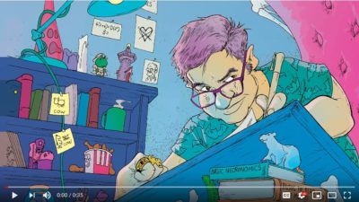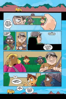 And of course the humor at times is at a very bathroom level. (Yes, I was amused.) And the illustrations are goofy (to say the least. You just have to see them). The cover shows you what you are in for: purple and blue hair, big eyes, spiky haired characters. Inside, you find on the pages an aunt riding a ram, a father telling dad jokes, a stepmother who needs to charge her cell phone, purple potatoes, neighbors who steal electricity (and who knows what else) and that lighthouse.