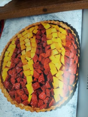 Let’s do a close look at the recipe and design I plan to start with, a tart recipe labeled “Spike a Pose”. I picked this one because the design is less intricate than some of the others and the filling sounded interesting. The crust is a standard pastry shell (see another page for recipe) fully pre-baked, and the filling is a black tea panna cotta, which is basically a tea flavored custard that involves gelatin, cream, milk, and sugar. So far so normal; these are all things I already have in my pantry, although I think the box of unflavored gelatin I saw may or may not be beyond it’s ‘use by’ date. The procedure is pretty clear and mostly standard for this kind of thing, heat and combine but avoid boiling at all costs. After setting in the fridge for a couple of hours, add topping and consume within two days. The topping in this case involves slicing strawberries in squarish and triangle-ish pieces (shapes which are close enough to the natural fruit shape that you just need a knife, and mangoes cut similarly. Direction are separately provided in every case for cutting and constructing the topping design, usually on the next page from the main recipe. In this case, you are told to use a toothpick to lightly draw a zigzag into the custard as a guide, and then fill in each section with alternating fruits. Results should be something like: