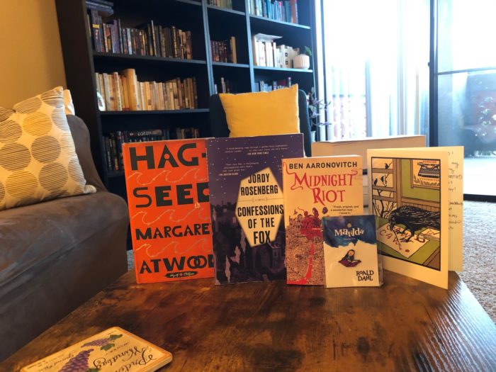 I ambled on over to my mailbox this afternoon and got a fun surprise from andtheIToldYouSos. I have been meaning to read Midnight Riot for ages and ages, I think it’s been on my TBR for eleven years now, so I’m really excited to finally have a copy. Confessions of the Fox I’m super intrigued about as the subject matter is extremely up my alley, and even though Hag-Seed wasn’t on my radar, I’m always interested in a Shakespeare adaptation. There is also a cute little enamel Matilda pin, which warms my heart, as it’s one of my favorite books. Truly, this is the most wonderful time of the year. Thank you so much, andtheIToldYouSos!