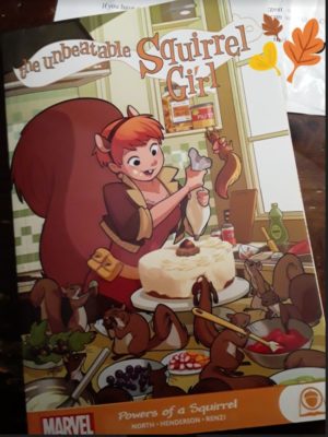 I was so VERY VERY VERY excited (if you have not guessed) about a superhero that was part squirrel/part girl. (I am easily distracted by shiny objects, squirrels, books in general and books that happen to have a shiny cover with a squirrel on it… true story actually). I was hoping that The Unbeatable Squirrel Girl: Powers of a Squirrel by Ryan North was going to be the COOLEST ever. Instead, I am not sure what I read. Every story (or individual comic, which was then collected into this collection) was Squirrel Girl (know for the rest of the review as SG) kicking butt and winning. What? Waiiit there a second, you say, that is what superheroes do! But the thing was, there are no real setbacks. She might have a bump or two, but you know she is going to win. There is no, “Oh! Maybe she won’t make it.” And her fight with Galticus was so dull I fell asleep. And (spoiler) she beats up The Avengers without even mussing up her hair?
